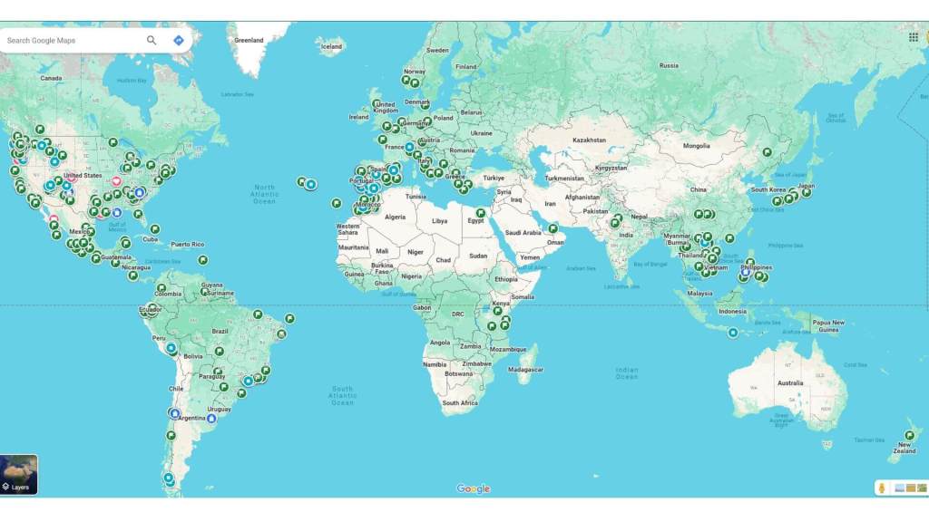 Here’s what my Google world map currently looks like thanks to these lists, each mark indicating memories or opportunities: