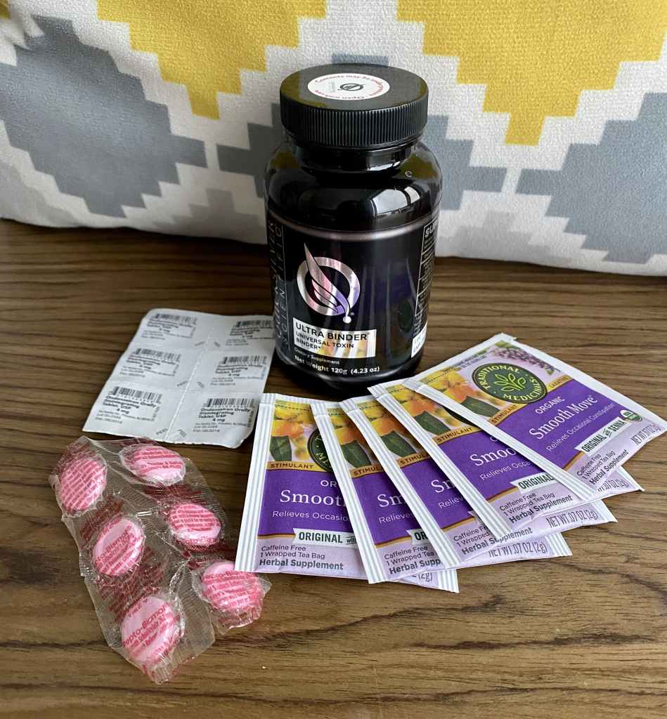 Since charcoal can’t be absorbed by the gut, it constipates you, significantly slowing down diarrhea. After being stopped up for a few hours, I finish the day with senna tea, a natural laxative. This helps to remove and eliminate the charcoal. The liquid in tea also helps with hydration.